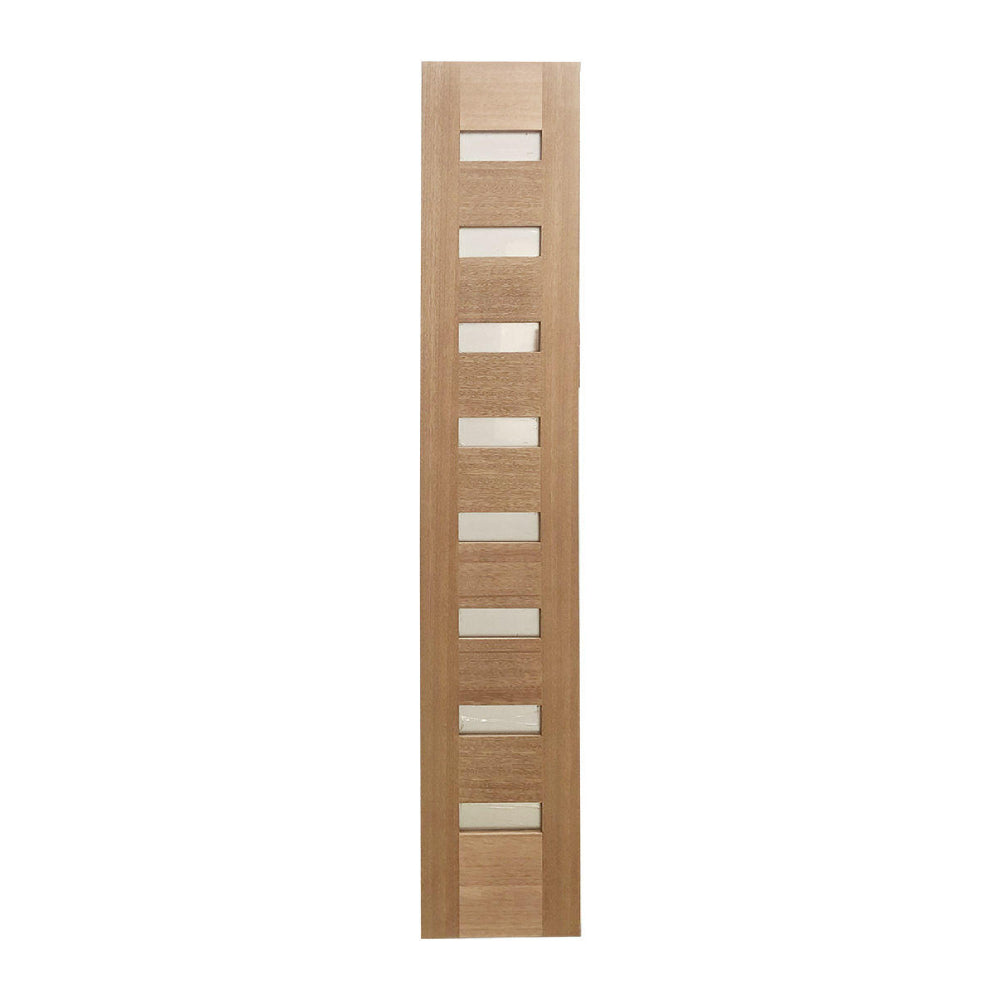 El panel lateral cuenta con ocho paneles de vidrio rectangulares dispuestos en forma de cuadrícula. El vidrio utilizado en este panel lateral es vidrio templado esmerilado, que ha sido tratado para crear una apariencia esmerilada u opaca. El vidrio templado es conocido por sus propiedades de resistencia y seguridad, ya que está diseñado para romperse en fragmentos pequeños y opacos si se rompe.