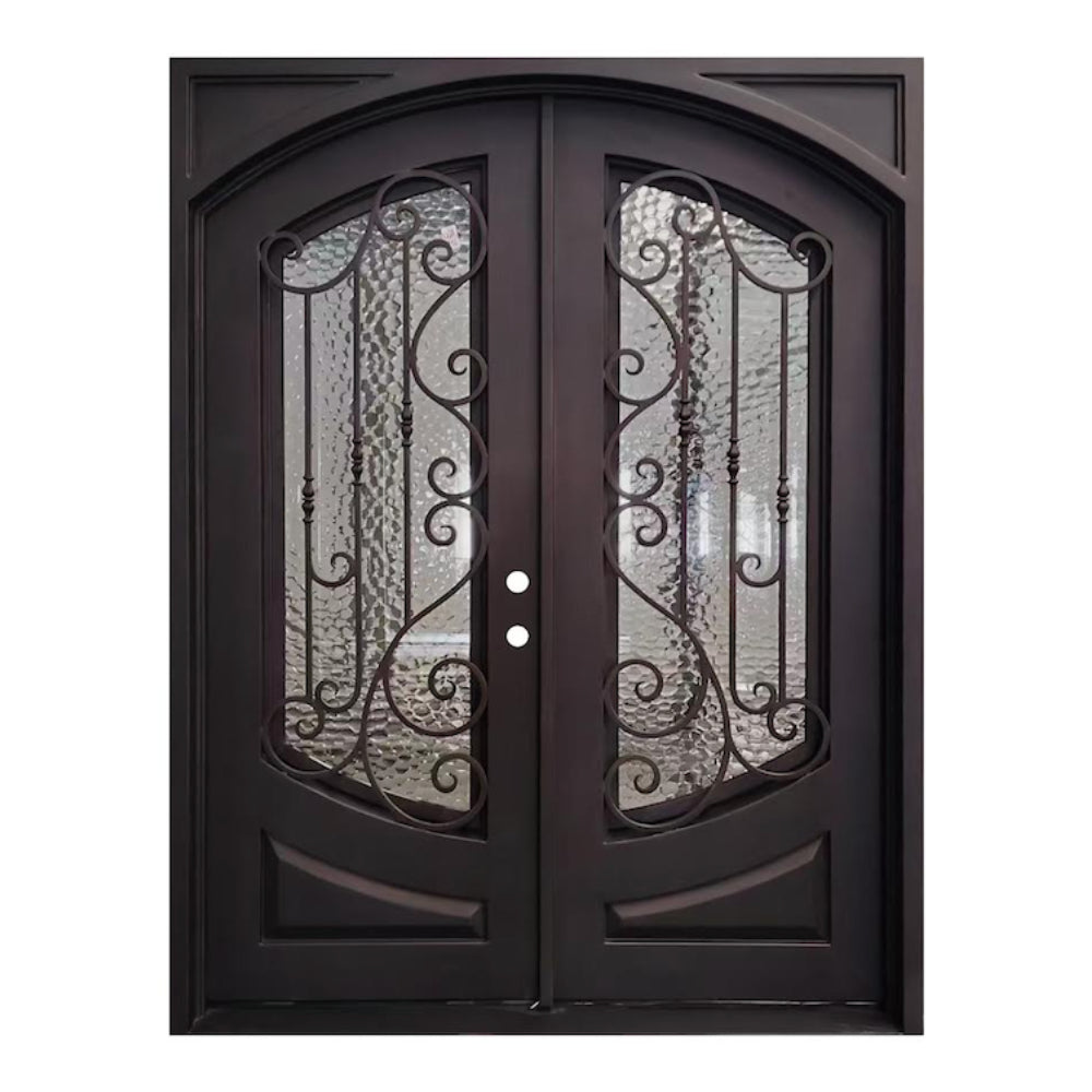 La puerta doble exterior de hierro forjado precolgada cuadrada Elina de 6/0 x 8/0 es una puerta de entrada robusta y de primera calidad diseñada específicamente para uso en exteriores. Construida con hierro duradero de calibre 14, esta puerta doble ofrece una resistencia y una longevidad excepcionales. Está completamente aislada, lo que la hace energéticamente eficiente y capaz de brindar aislamiento de los elementos externos.