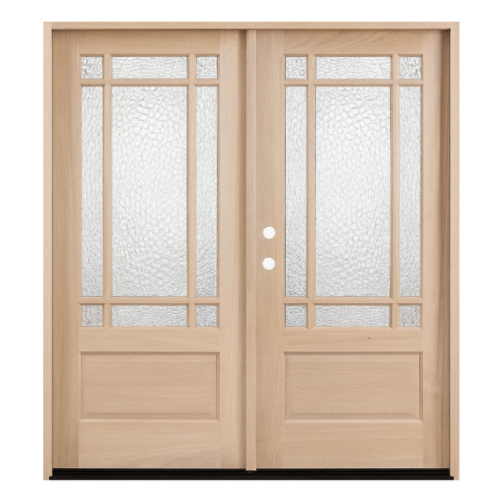 Upgrade your home's entryway with the Prairie 6/0x6/8 Mahogany Prehung Front Double Door With 9 Marginal Lites. Crafted from high-quality mahogany wood, this pre-hung door comes with its own frame, ensuring easy installation and immediate enhancement of your home's curb appeal. The clear glass is surrounded by wood mullions, adding a touch of elegance to the door's design. With a solid core and a thickness of 1-3/4 inches, this door provides both strength and stability. The unfinished surface allows for customization with paint or stain to match your desired color scheme. The pre-hung mahogany frame includes weatherstripping for added protection against the elements, while the in-swing design ensures convenience. Available in left and right hand swing, this exterior door also offers options for Flemish glass or clear double pane tempered glass.